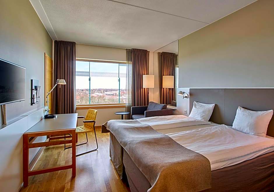Room on the upper floors with magnificent city views. Free toiletries from FACE Stockholm are included.